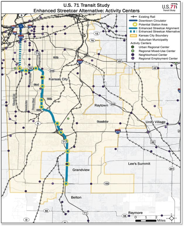 The enhanced streetcar would serve a third phase of the KC streetcar system (phase II would be to the Plaza). The streetcar would travel on the west side of US 71 and ends at M-150. A feeder bus network would also be a part of this alignment.