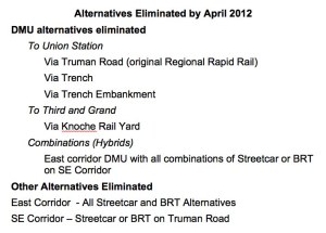 All Rock Island Corridor Streetcar or BRT combinations with a DMU on the I-70 Corridor – These alternatives all require a forced transfer at the Truman Sports Complex. (See video about all eight combinations Enhanced Streetcar/DMU/BRT Combinations Are Discussed). This issue affects four of the eight combination alternatives. (See combinations marked in yellow on JCCCAA Modal Combinations Update March 2012)