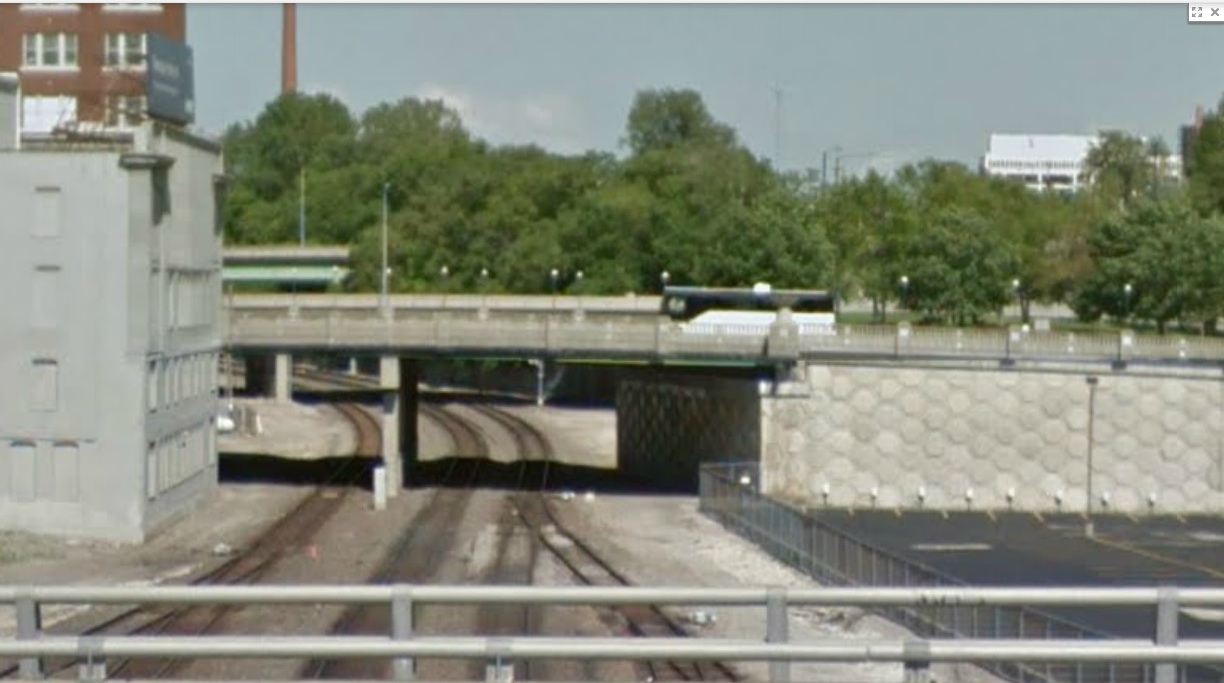 Another option then is to build an additional track from Rock Creek Junction to Union Station. This turns out to be extremely expensive. According to a consultant working with the MARC team, who has looked closely at this alternative in the past, the cost would be around $1 billion – almost ten times the cost of going to Third and Grand! Here’s the problem. For approximately two miles east of Union Station the tracks lie in a “trench” (Grand Ave. to 18th Street, just east of the “Benton curve” on I-70). When Union Station was built, the trench contained four “thru” tracks. There were additionally two tracks on either side of the thru tracks which led to other tracks running up and down the sides of the trench serving rail shippers lining the right-of-way above track level. [See black and white photograph of arriving Kansas City Southern train taken from (we think) the Forest Ave. bridge in, probably, the 1950’s.] Today there are just three tracks in the trench. This is for two reasons: Revised safety standards have increased the distance between tracks thought to be safe, and changes in maintenance practices since 1914 require the use of rubber-tired, road-based equipment. So the trench now needs to accommodate a service road. Therefore, in order to add an additional track two things are required: 1. One of the sides of the trench would need to be excavated for at least part of the two-mile length, and 2. Most of the 15 bridges that cross the trench would have to be modified or rebuilt. [See photographs from Google Maps below to get an understanding of the topography and bridge constraints.] It is not difficult to intuitively understand the $1 billion figure.