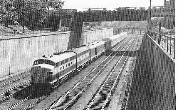 Kansas City Southern train in “trench” east of Union Station, probably taken in the 1950’s from Forrest Ave. Bridge. Note the six tracks in the trench. The next bridge east is Tracy Ave. Note the ramp which rises from the bottom of the trench on the right and comes up toward the viewer under Tracy Ave. and another one going back toward the east. These carried tracks from the trench level up to businesses on the right. In fact you may be able to make out a freight car next to the brick building on the far right.