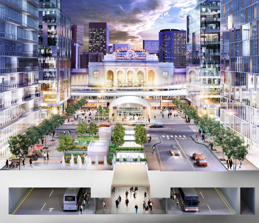 Rendering of Denver Union Station showing new streets, pedestrian mall and underground bus-way. Note development on either side of street/pedestrian mall. Subterranean walkway, surface streets and pedestrian mall connect to light rail stop.